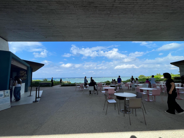 こちらは星野リゾート沖縄に隣接するカフェです。海辺にある大きな珊瑚の奇岩に対抗するかのように大きなコンクリートの屋根がかかっていました!